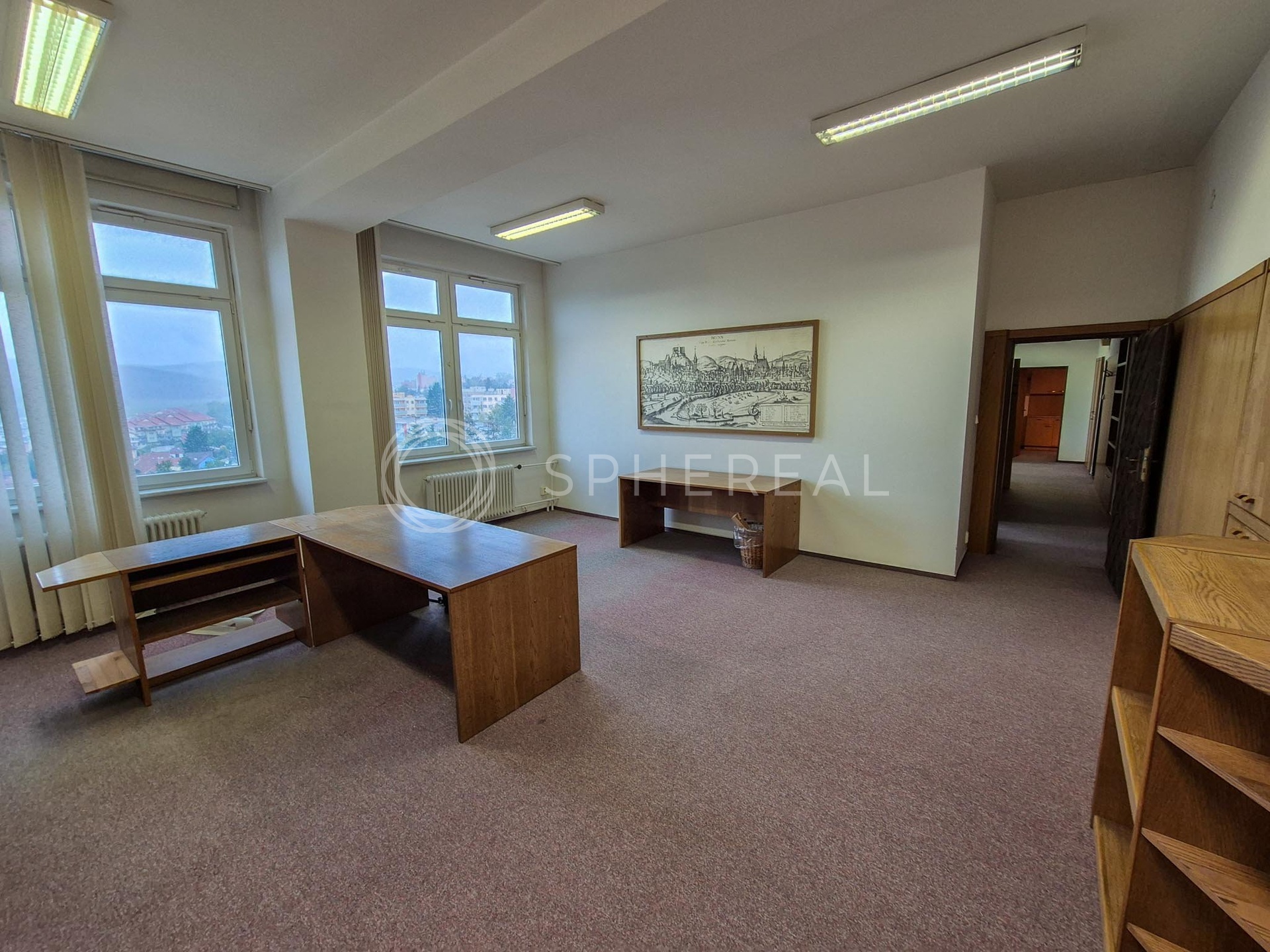 Prostory se nachází v 9.NP s krásným výhledem do okolí a jsou rozděleny do dvou větších a jedné menší kanceláře, vstupní místnosti a kuchyňky. Místnosti jsou vybaveny nábytkem, koberci a žaluziemi a připraveny k okamžitému nastěhování.